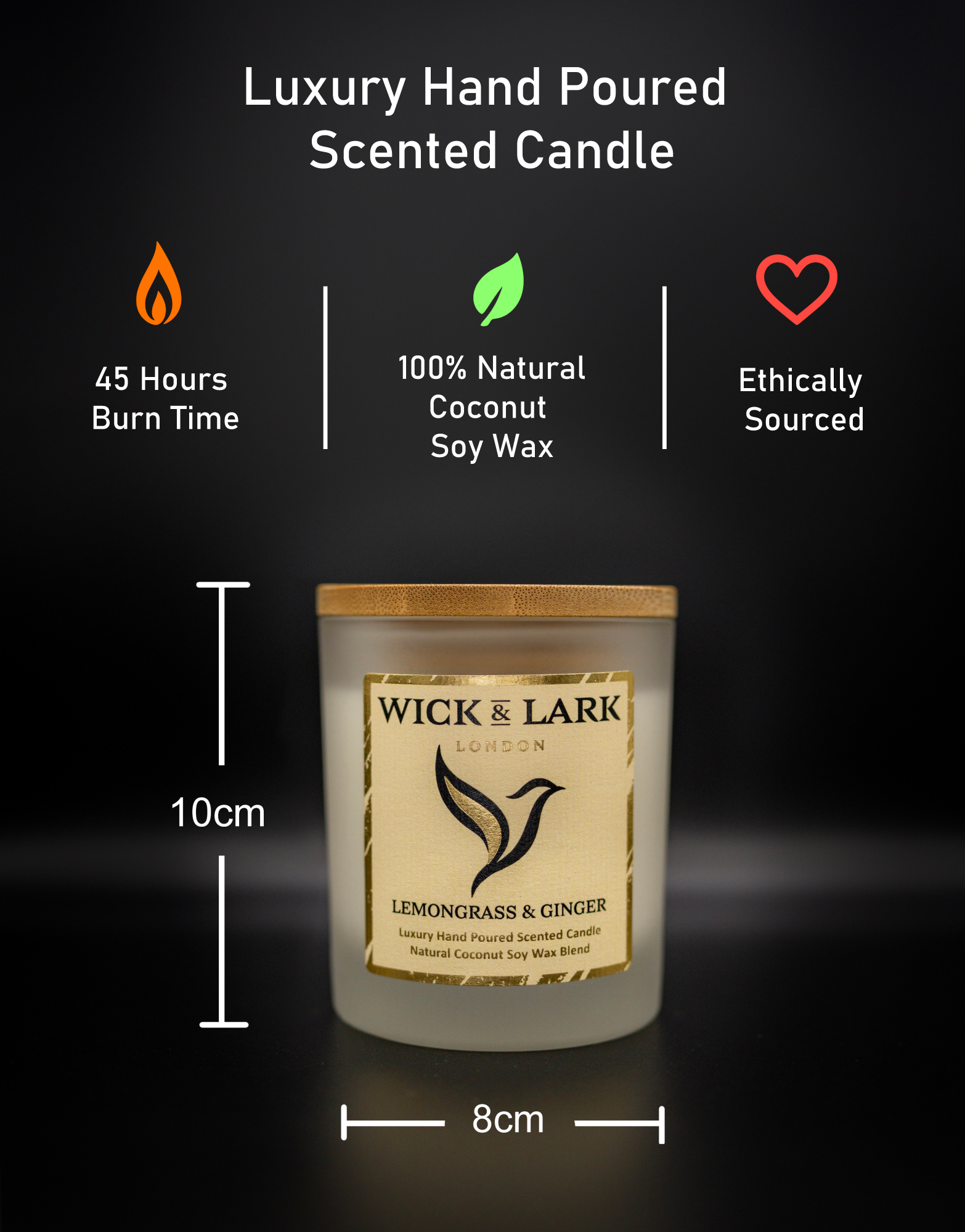 45 hour burn time. coconut soy wax blend. Ethically sourced.
