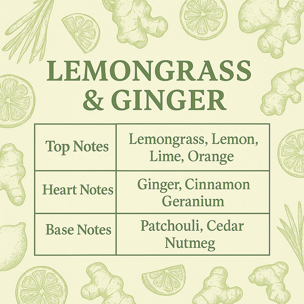 Zesty citrus and lemongrass energise the scenses, with warming ginger and cinnamon at the heart. Earthy patchouli and nutmeg create a soothing, grounded finish.